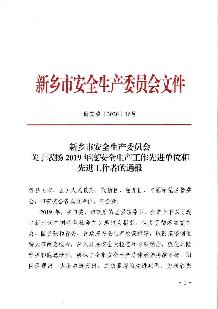 (發(fā)布時(shí)間:2020-07-20 點(diǎn)擊:4429)日前,從新鄉(xiāng)市安全生產(chǎn)委員會(huì)傳來消息,我公司被新鄉(xiāng)市安全生產(chǎn)委員會(huì)評(píng)為“2019年度安全生產(chǎn)工作先進(jìn)單位”。這一榮譽(yù)稱號(hào)的獲得,是對(duì)我公司安全生產(chǎn)工作的高度認(rèn)同和表揚(yáng)。
