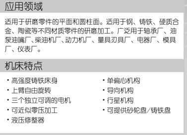 機床備有液壓修整器、單偏心機構(gòu)、導向機構(gòu)和行星機構(gòu)。根據(jù)特殊訂貨要求可供應砂輪盤。