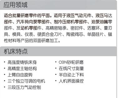 本機(jī)床為自動、高效率機(jī)床,適用于批量研磨零件。主要用于研磨零件的平面,適用于鋼、鑄鐵、銅、硬質(zhì)合金、陶瓷、單晶硅等的加工??梢詮V泛用于液壓氣動元件、液壓馬達(dá)部件、汽車燃油泵部件、制冷壓縮機(jī)零部件、油泵油嘴零部件、發(fā)動機(jī)零部件、高精密軸承滾柱及套圈、密封件、活塞環(huán)、量刃具、模具、儀表、硬質(zhì)合金刀片、陶瓷閥芯、磁性材料等產(chǎn)品的雙面研磨加工。