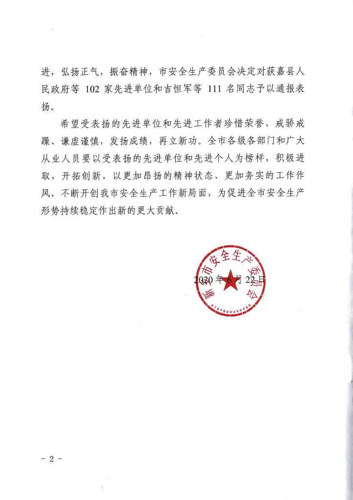 (發(fā)布時(shí)間:2020-07-20 點(diǎn)擊:4429)日前,從新鄉(xiāng)市安全生產(chǎn)委員會(huì)傳來消息,我公司被新鄉(xiāng)市安全生產(chǎn)委員會(huì)評(píng)為“2019年度安全生產(chǎn)工作先進(jìn)單位”。這一榮譽(yù)稱號(hào)的獲得,是對(duì)我公司安全生產(chǎn)工作的高度認(rèn)同和表揚(yáng)。