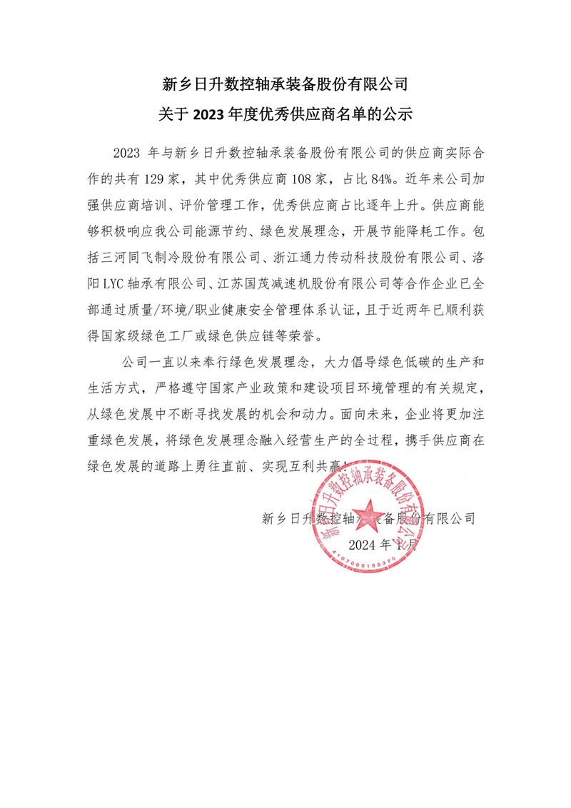 新鄉(xiāng)日升-優(yōu)秀供應(yīng)商公示