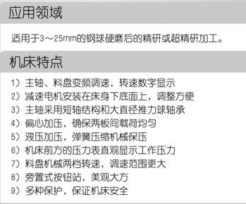 本機床是軸承廠和專業(yè)鋼球制造廠加工鋼球用的專用機床,適用于3~25mm的鋼球硬磨后的精研或超精研加工。(對于直徑3 mm ~5 mm的鋼球還可以進(jìn)行硬研加工以代替硬磨工序。)經(jīng)本機床加工后的鋼球精度可達(dá)G10~G5級。